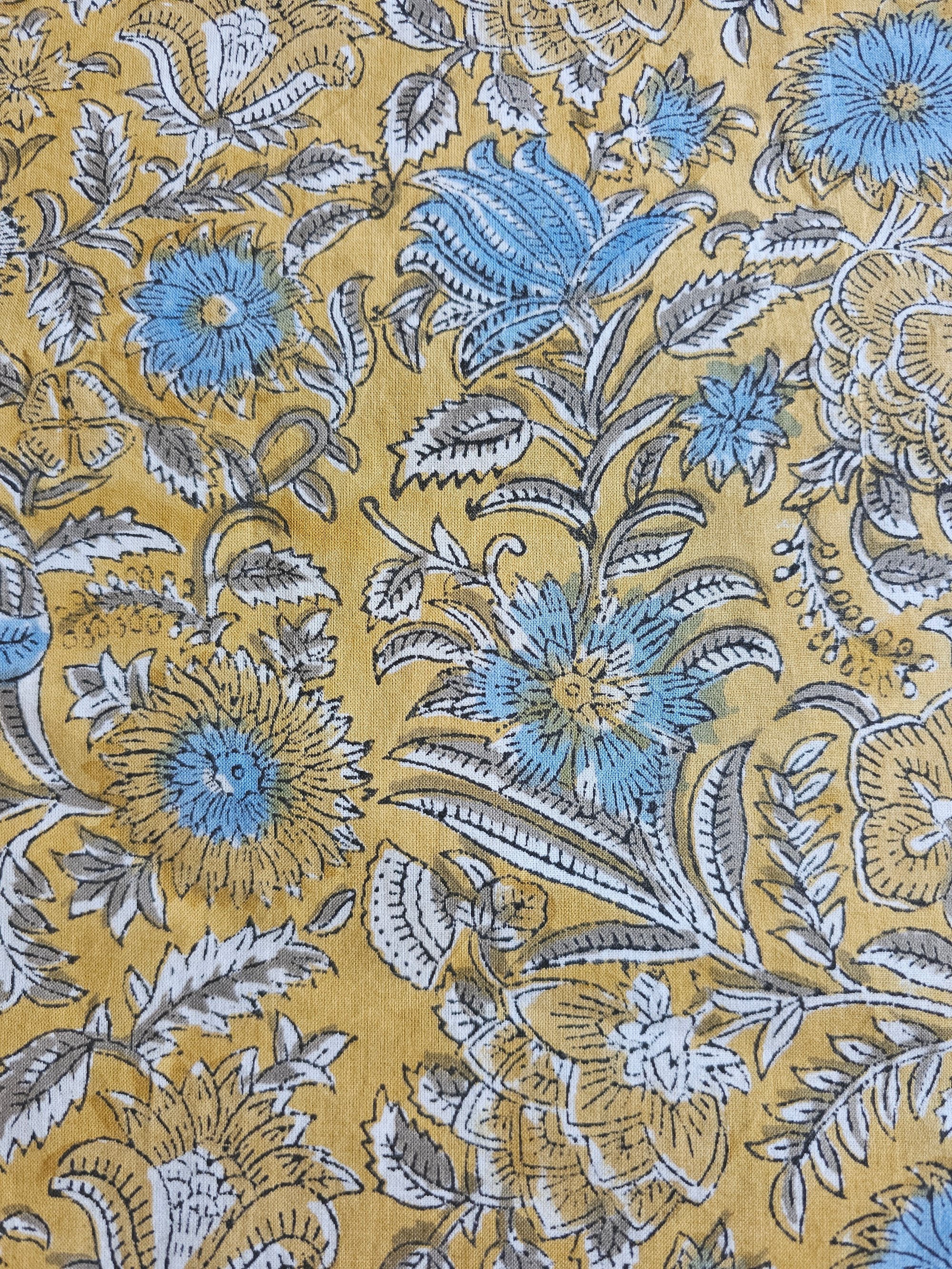 Tissu indien en coton avec un fond moutarde avec des fleurs bleues et blanches.