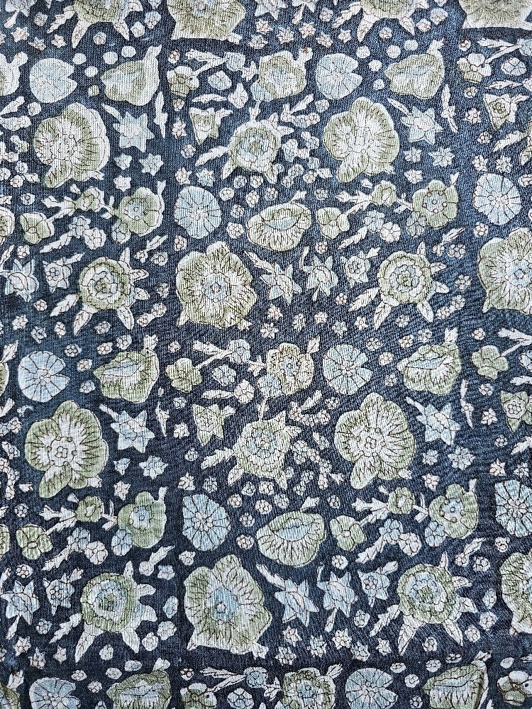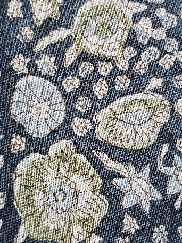 Tissu indien en coton avec un fond marine avec des fleurs beiges.
